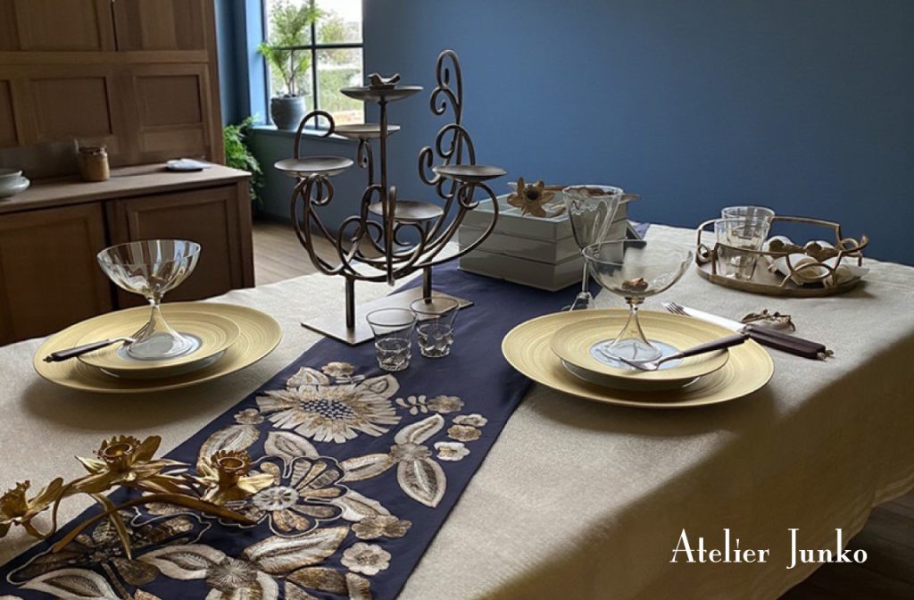 ゴージャスな刺繍のランナーや水仙モチーフのキャンドルスタンドが特別なおもてなしの気持ちを伝えます。